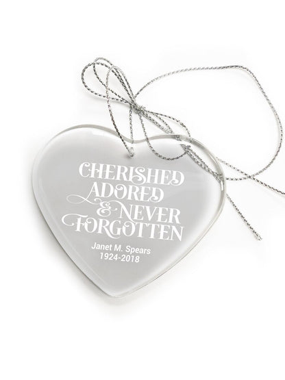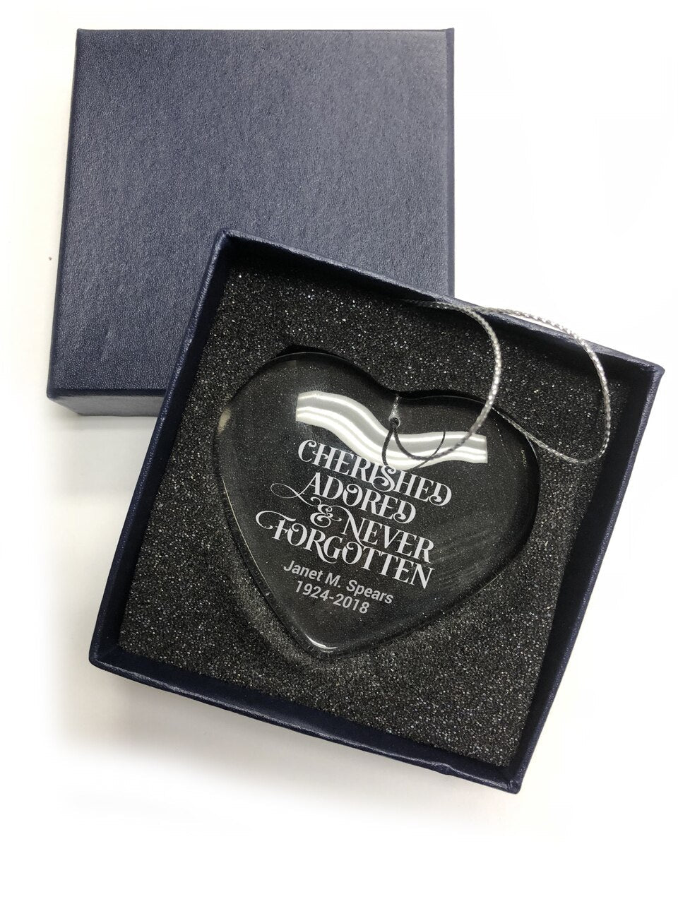 The Crystal Heart Memorial Christmas Ornament from The Funeral Program Site is a touching and timeless keepsake designed to honor a loved one during the holiday season and beyond. Handcrafted from premium crystal glass, its softly curved heart shape beautifully reflects surrounding light, creating a warm and glowing tribute. The front features the engraved memorial phrase, “Cherished Adored & Never Forgotten,” with room beneath for two lines of your personalized text, making each piece uniquely meaningful. This elegant ornament comes with a silver hanging string ready for display on a Christmas tree or in a special remembrance space throughout the year. Each ornament is carefully gift boxed, making it a thoughtful sympathy gift that will be treasured for generations. Because every piece is handmade, size may vary slightly, measuring approximately 3" long by 2.5" high.