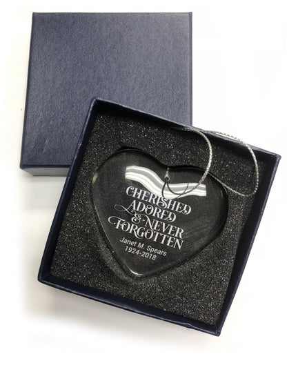 This beautiful Crystal Heart Memorial Christmas Ornament offers a heartfelt way to honor a loved one during the holiday season. Handcrafted from delicate crystal glass, each ornament features a gently curved heart shape that catches the light beautifully. The front is engraved with the memorial phrase “Cherished Adored & Never Forgotten”, and you may personalize it with two lines of your own custom text beneath the word art.