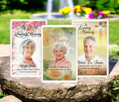 The Funeral Program Site presents the Custom Cover Funeral Prayer Card Template, an elegant and meaningful way to feature your loved one’s photo on a beautifully designed background. Families may choose from a variety of signature designs, allowing the Custom Cover Funeral Prayer Card Template to showcase one special photo that is digitally enhanced and expertly placed for a frameless, polished presentation. This thoughtful layout ensures the front of the card remains visually expressive and heartfelt.