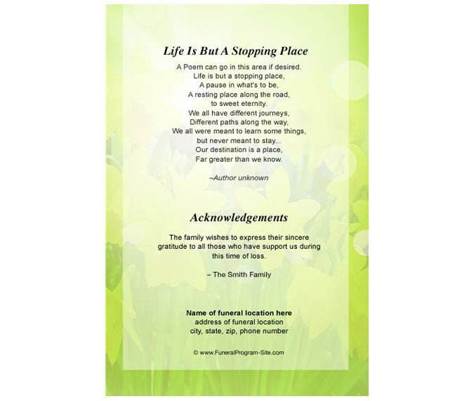 The Daffodils 4-Sided Graduated Funeral Program Template features a vibrant and uplifting design, adorned with cheerful yellow daffodils along the border. Set against a serene green background with a soft bokeh glow, this template brings a sense of renewal, hope, and gentle remembrance. The decorated frame on the front beautifully highlights a cherished photo and custom text, creating a meaningful tribute. The Daffodils 4-Sided Graduated Funeral Program Template offers a professional yet heartfelt layout for honoring a life filled with warmth and light.