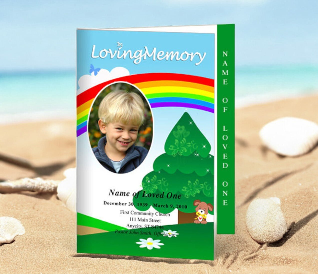 The Delight 4-Sided Graduated Funeral Program Template features a bright and uplifting outdoor scene with an illustrative landscape and a radiant rainbow-filled sky. This vibrant and peaceful imagery offers a comforting atmosphere, making it a thoughtful choice for celebrating a joyful and loving life. The front cover includes elegant word art that reads "In Loving Memory," adding a heartfelt touch to the presentation. The Delight 4-Sided Graduated Funeral Program Template provides a warm and cheerful way to share personal tributes, service details, and memories.