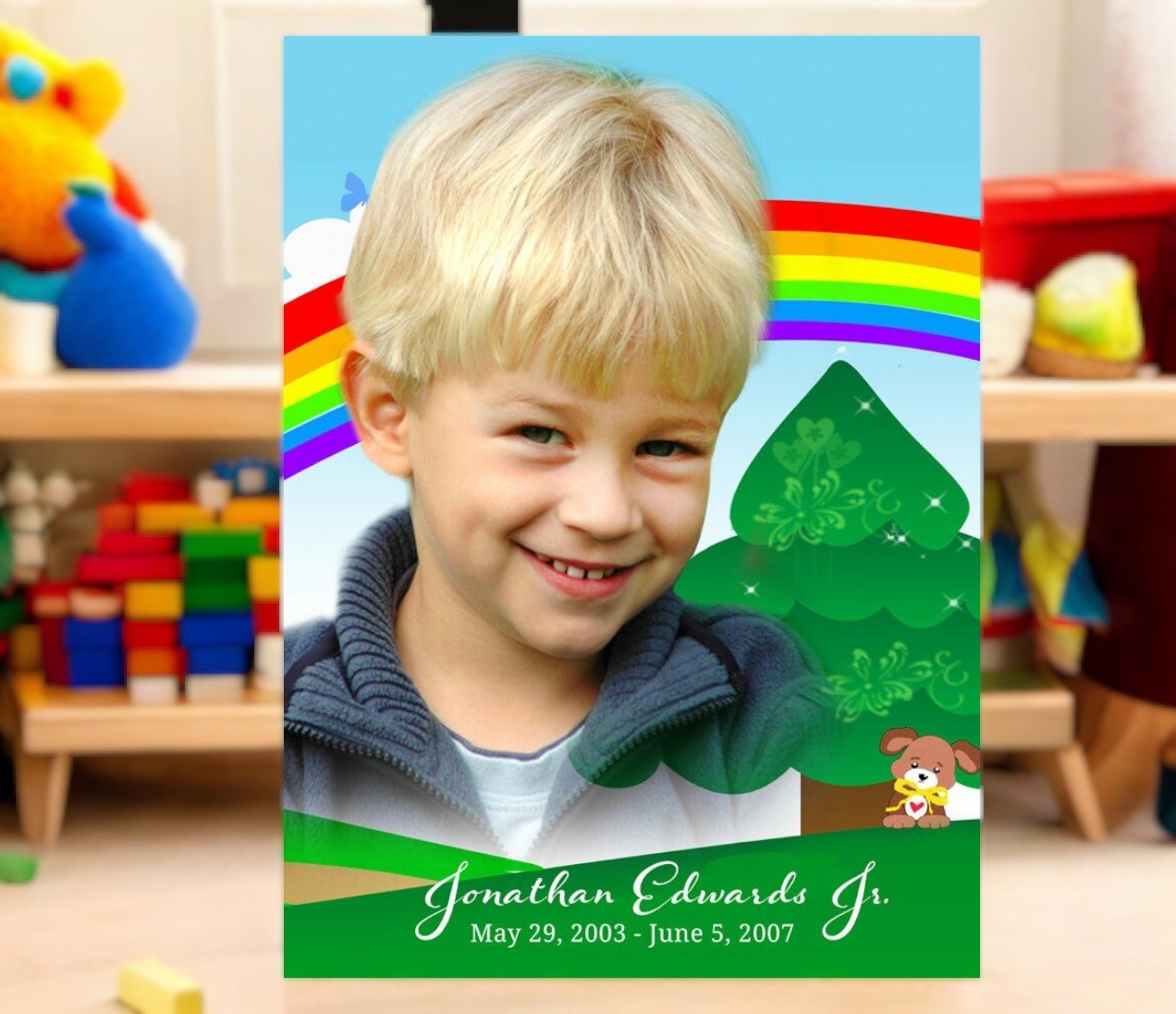The Delight Funeral Poster Memorial Portrait from The Funeral Program Site offers a tender and heartwarming way to celebrate the memory of a young soul. This charming design features a cheerful illustration with a tree, rainbow, and playful dog, creating a sweet and uplifting background for your chosen photo. Perfect for honoring the innocence and joy of youth, this portrait transforms precious memories into a lasting keepsake.