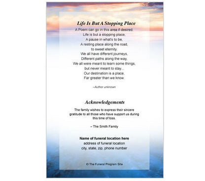 Embrace the beauty of a peaceful farewell with the Dusk 8-Sided Graduated Funeral Program Template. This serene design features a tranquil blue ocean beneath a breathtaking sunset horizon, capturing the calm and reflective mood of dusk. The soft tones and natural scenery offer a comforting atmosphere, perfect for honoring a loved one’s memory with grace and tenderness.