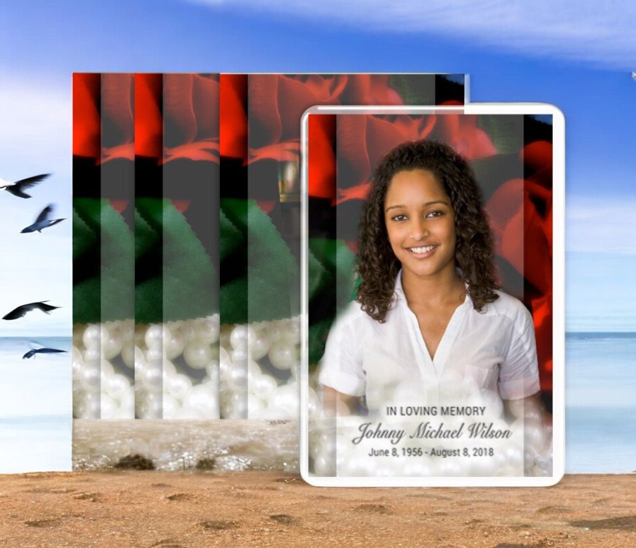 From The Funeral Program Site, this elegant funeral prayer card design showcases a breathtaking floral arrangement of deep red velvet roses resting gracefully upon a bed of shimmering white pearls. The rich tones and delicate details create a timeless and refined presentation, offering a beautiful way to honor your loved one’s life with grace and sophistication.