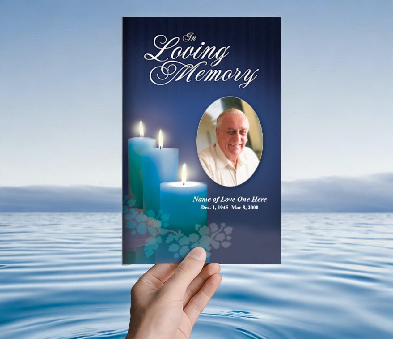The Enlighten Funeral Program Template offers a beautifully serene tribute, featuring a trio of softly glowing blue-green candles adorned with delicate floral accents against a rich midnight blue background. The tranquil ambiance of the design evokes a sense of peace and remembrance, making it a meaningful choice for honoring a loved one. The Enlighten Funeral Program Template extends its calming aesthetic to the back, where the midnight blue background continues, creating a cohesive and elegant presentation.
