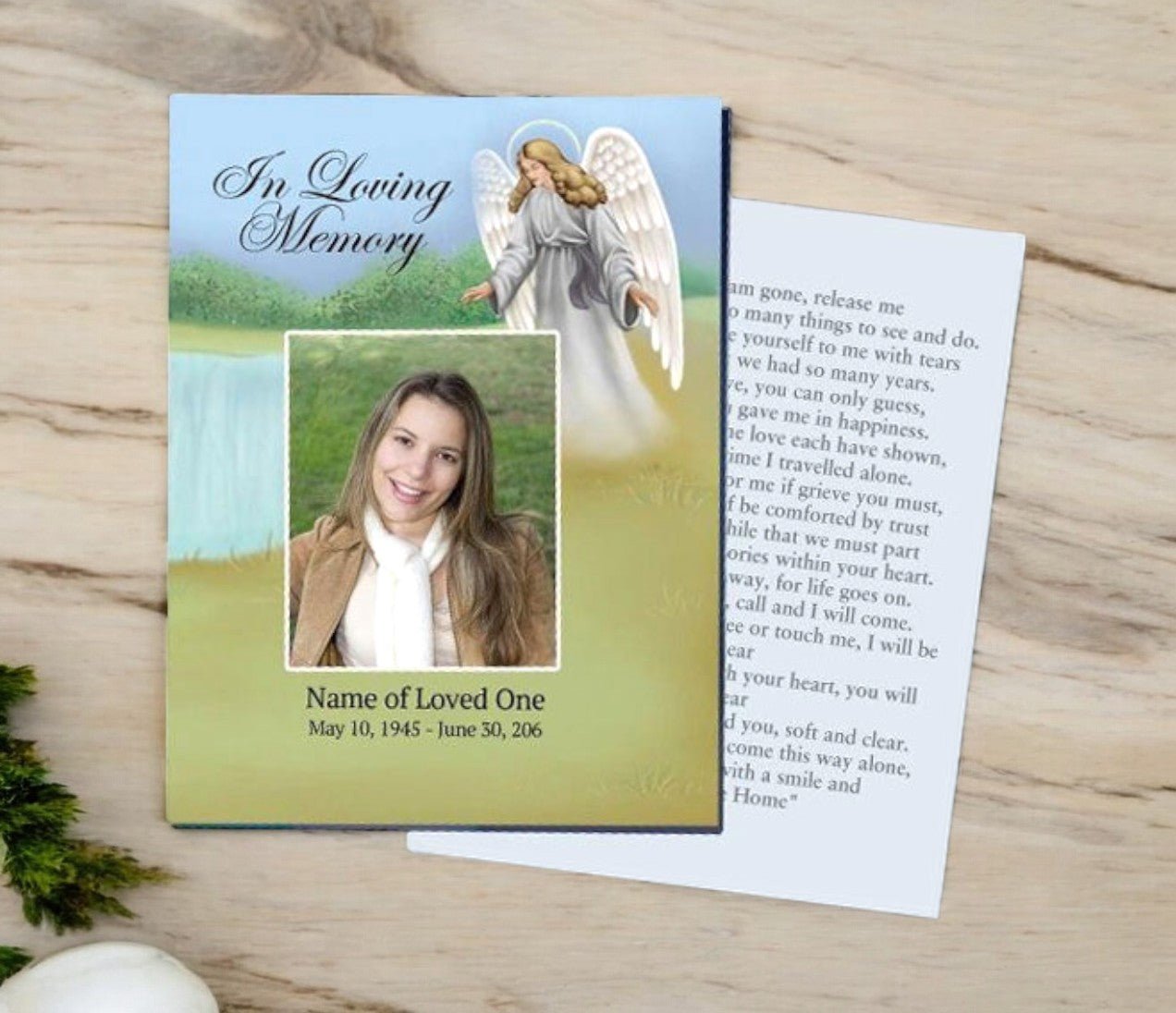 The Eve Small Memorial Card Template offers an elegant and faith-centered design, perfect for honoring a loved one's spiritual journey. The front features a serene and uplifting design, reflecting peace and reverence, while emphasizing the importance of faith.