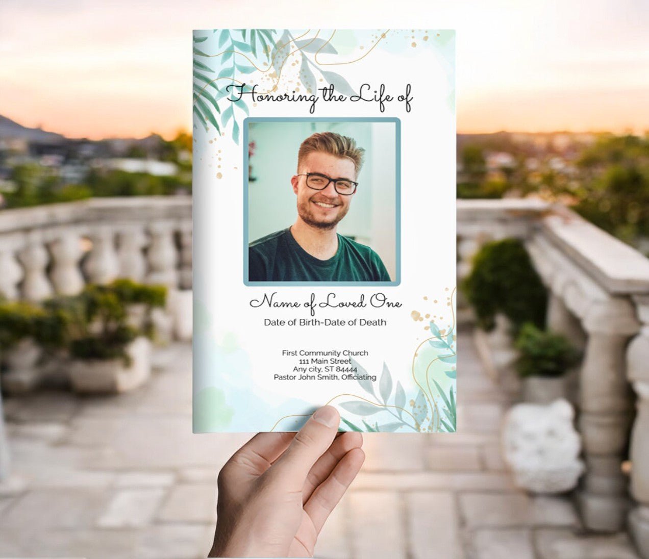 The Fir Online Funeral Program Template features delicate fir foliage framed around your photo, set against a clean white backdrop. This simple yet elegant design brings a sense of calm and nature’s beauty, making it a fitting tribute to your loved one.