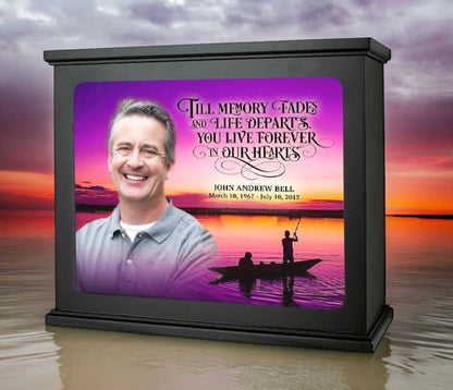 When illuminated, the warm light enhances the natural beauty of the landscape, evoking comfort and reflection. The heartfelt quote, “Till memory fades and life departs, you live forever in our hearts,” completes this meaningful piece, making the Fishing At Sunset Photo Light Box Memorial a timeless tribute filled with love and serenity.