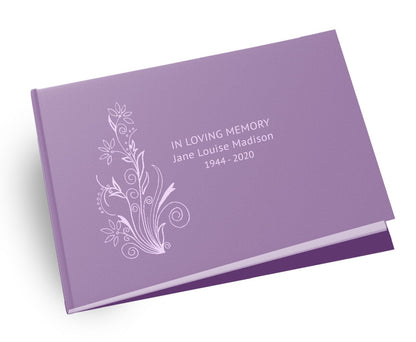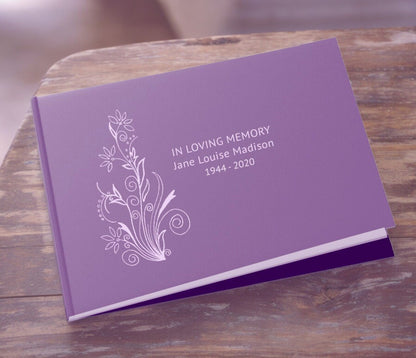 The Funeral Program Site linen-covered funeral guest book features a delicate floral blossom design alongside three lines of personalized text, thoughtfully imprinted in a color that complements the soft fabric cover. This elegant layout provides a graceful way for guests to record their names, messages, and cherished memories, creating a meaningful keepsake of your loved one’s celebration of life. Ideal for any funeral or memorial service, this guest book combines beauty and functionality, offering a lasting tribute that family and friends can treasure for years, preserving the heartfelt sentiments shared during this special occasion.