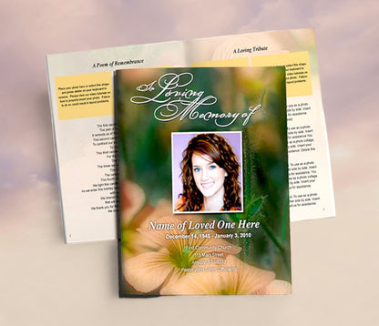 The Floral Funeral Booklet Template offers a delicate and beautiful tribute, featuring soft peach florals paired with lush green foliage for a stunning design. This serene and elegant template captures the natural beauty of flowers, creating a peaceful and heartfelt atmosphere that honors your loved one's memory.