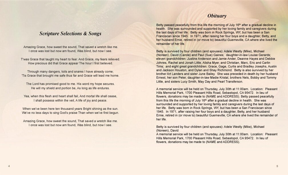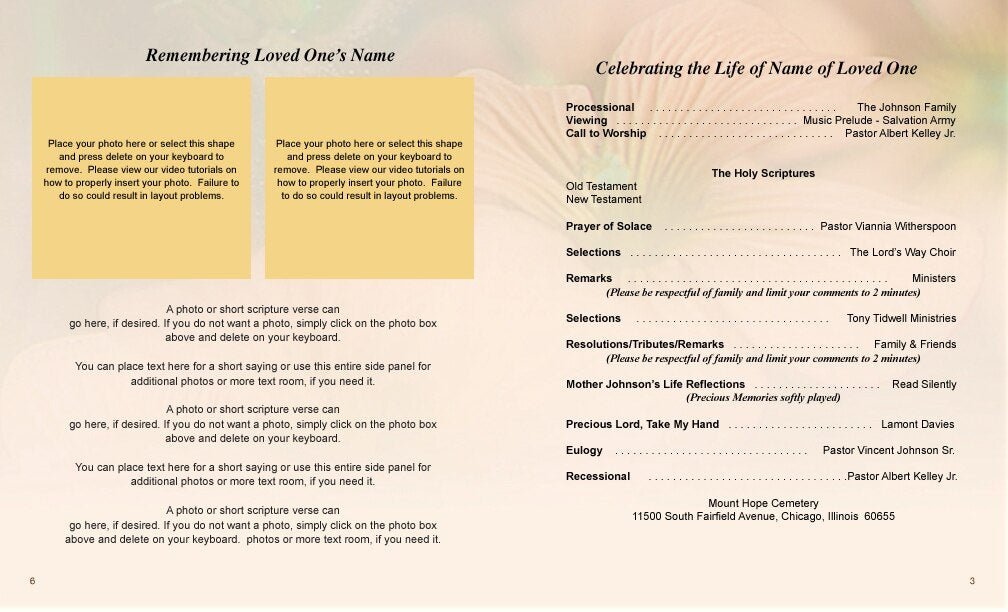 A funeral booklet template is a pre-designed framework that helps individuals or families create a personalized funeral booklet for memorial services. These templates provide a basic structure, including a cover page, an internal layout for content, and a back cover, which users can customize with text, photos, and other personal touches. The primary purpose of these templates is to simplify the process of compiling a comprehensive and polished booklet that honors the life of the deceased while providing attendees with a guide to the funeral or memorial service.