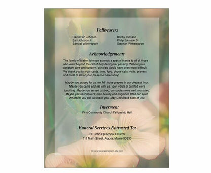 The reverse side of the Floral Funeral Booklet Template continues with the elegant floral theme, enhanced by a white overlay. This transparent layer is ideal for adding poetry, Bible verses, or special acknowledgments, allowing you to personalize the booklet in a meaningful way. The Floral Funeral Booklet Template is a timeless keepsake, offering a graceful tribute to your loved one.