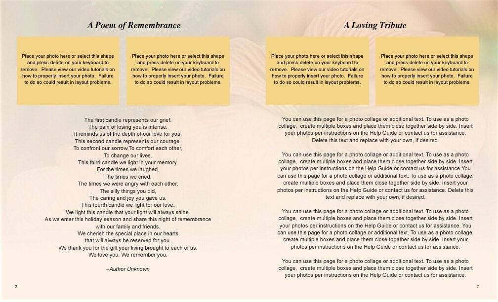 Funeral booklets formatted in an 8-page or 8-sided layout (2 sheets printed front and back). Add more pages if needed. Ready to edit and print on your own home printer or local copy shop.