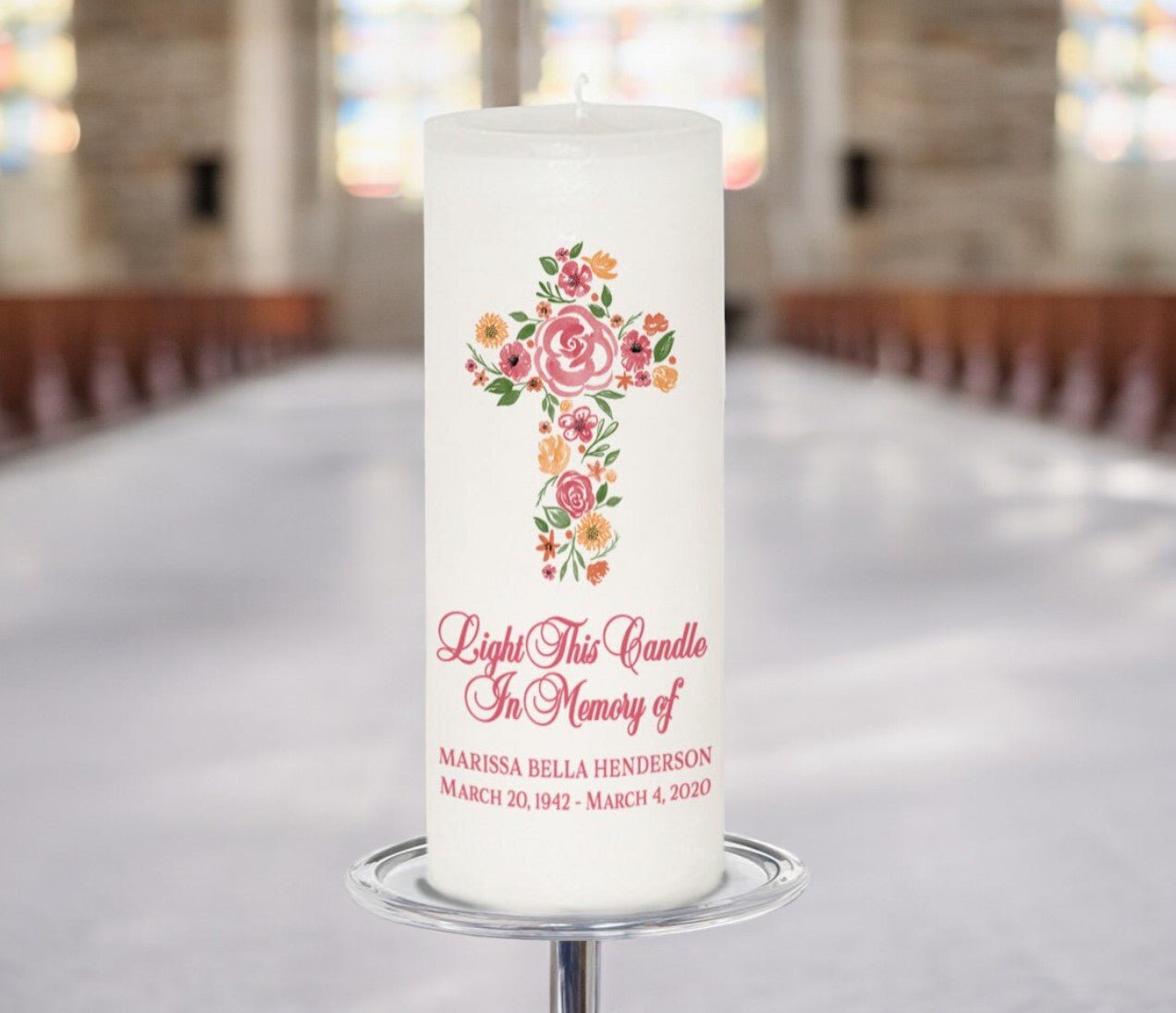 Flowers Cross Personalized Wax Pillar Memorial Candle
