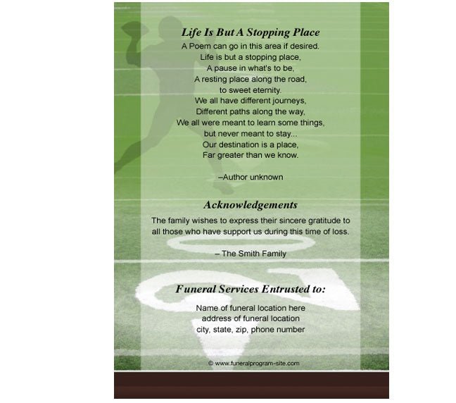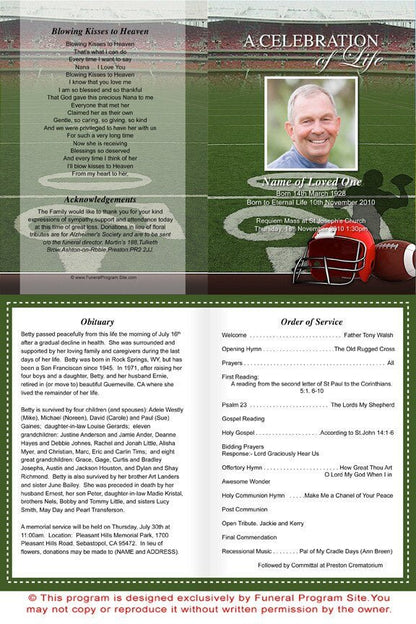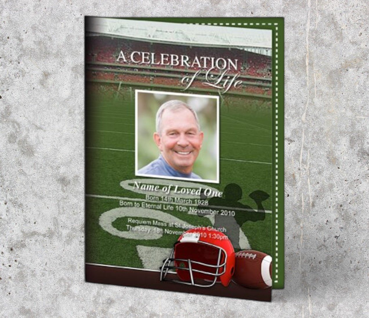 The Football A4 Funeral Order of Service Template is the perfect choice for honoring a sports enthusiast or fan. Featuring a dynamic football-themed design, this template celebrates the spirit and passion of the game while providing a respectful tribute to your loved one.