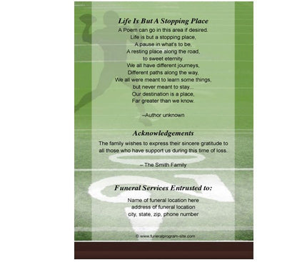The back of the Football A4 Funeral Order of Service Template features a white transparent overlay, offering an ideal space for a heartfelt poem, brief obituary, or biography. The template’s main color scheme, with green and brick hues, reflects the colors of the game, adding warmth and energy. The inside of the program showcases a complementary gradient design, creating space for the order of service, poetry, or a completed obituary, making the Football A4 Funeral Order of Service Template a meaningful and personal way to celebrate your loved one’s life.