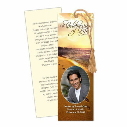 The Footprints Memorial Bookmark Template features a touching design inspired by the beloved Footprints in the Sand poem. A single set of footprints gently marks the sandy beach as they lead toward a peaceful sunset sky, creating a serene and meaningful backdrop. The Footprints Memorial Bookmark Template offers the option to include your loved one's photo in either a rectangle or oval frame on the front or back, making it a heartfelt keepsake.
