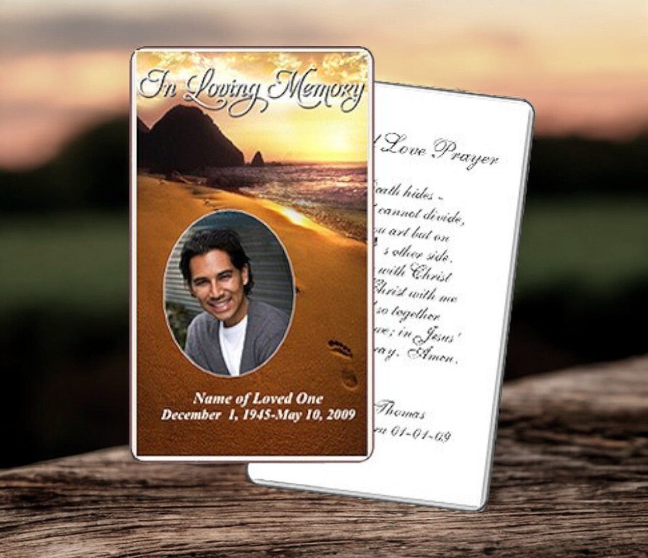 Introducing the Footprints Prayer Card Template, featuring a serene beachfront scene with glistening footprints symbolizing a life's journey. This funeral prayer card template is adorned with sunset yellow and orange hues, capturing the warmth and beauty of memories. Customize the front cover title with your preferred wording and fonts to create a personalized tribute.
