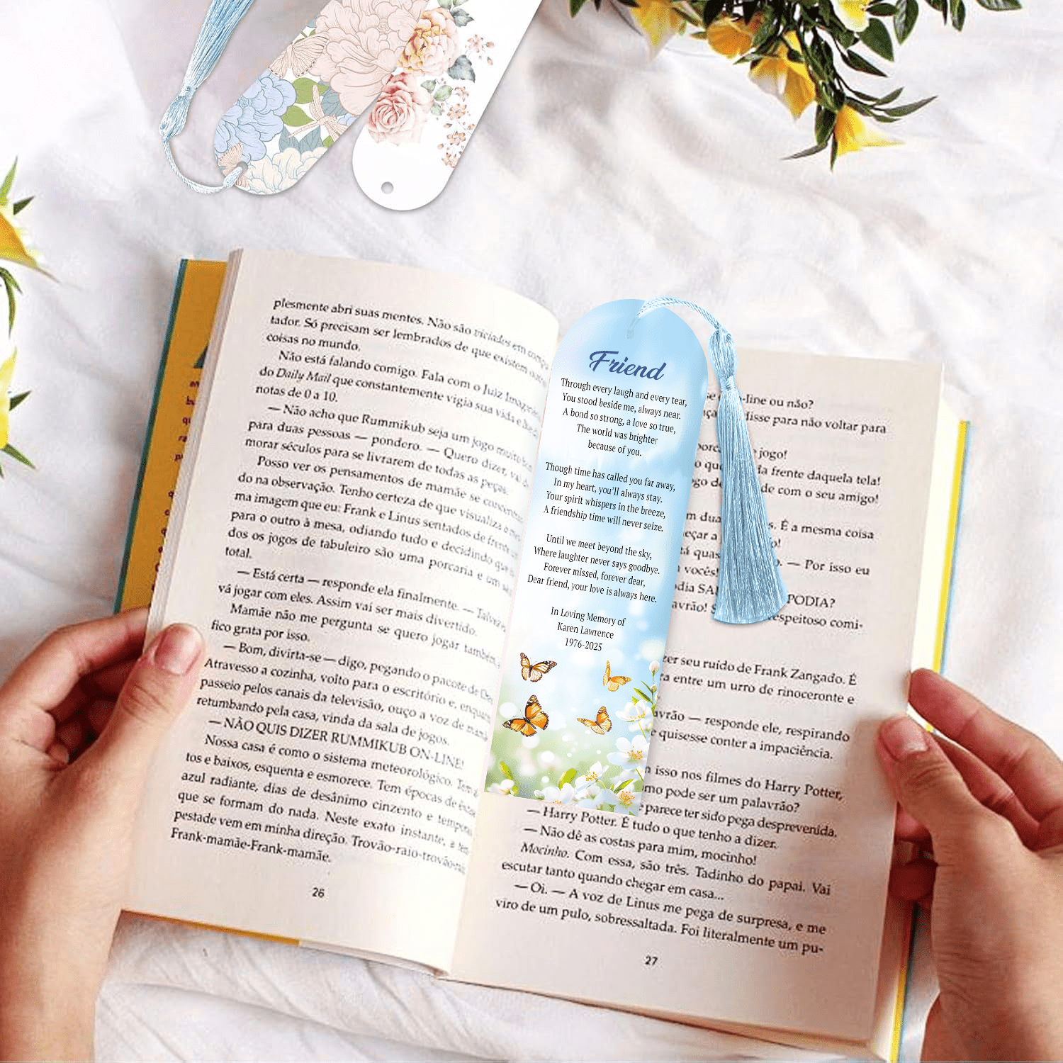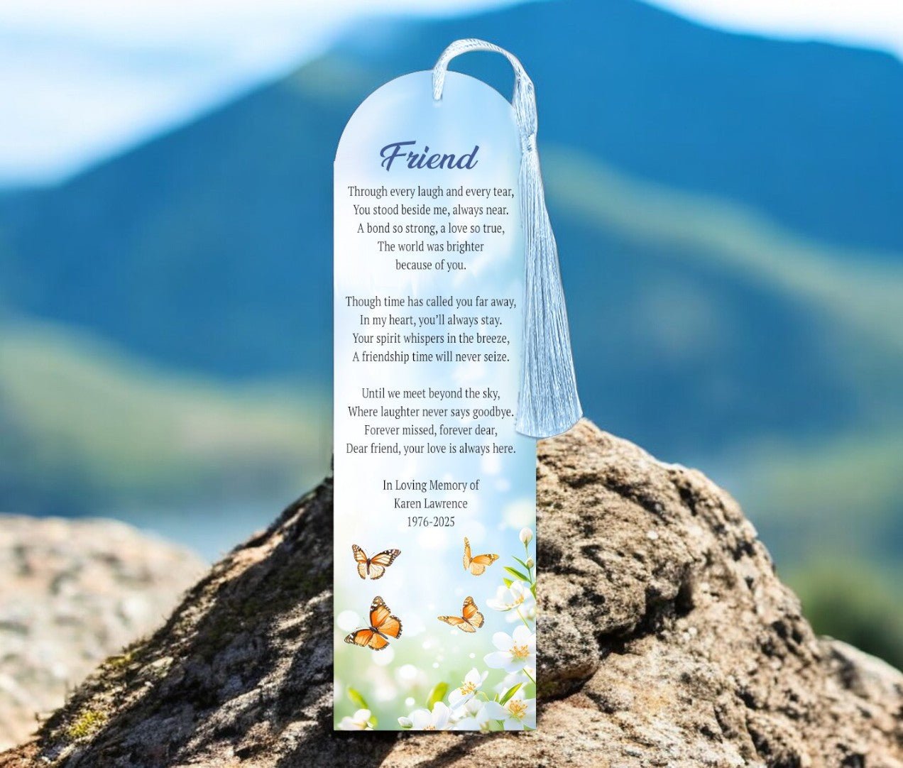 The Friend Poem Aluminum Memorial Bookmark is a touching tribute designed to honor a cherished friend. Featuring a beautiful background with delicate butterflies and soft floral accents, this bookmark perfectly complements the heartfelt poem. The poem reflects the enduring bond of friendship and the lasting love that never fades, even after parting.