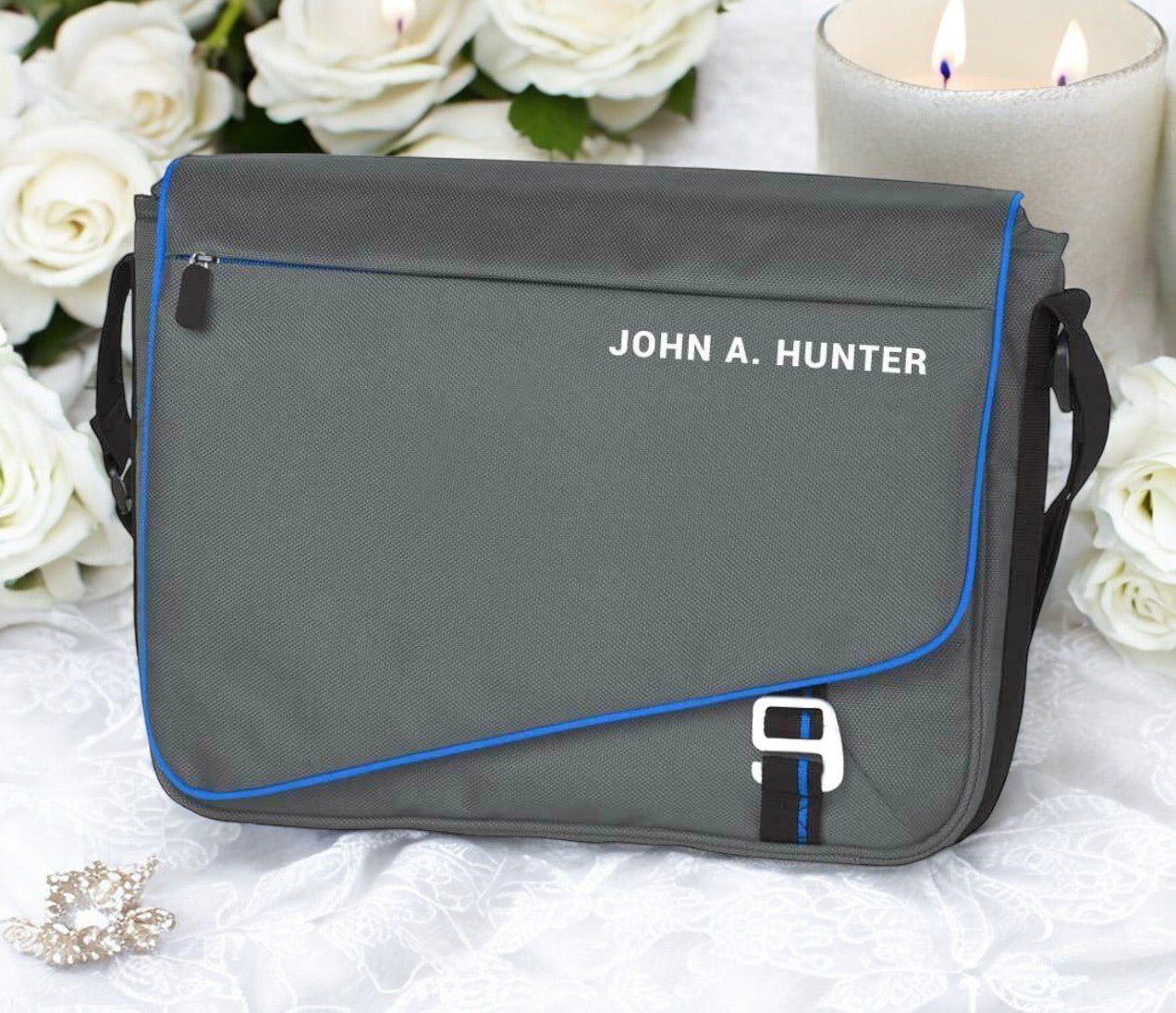 The Funeral Program Site presents a stylish Funeral Director Transit Messenger Bag features a modern asymmetrical front flap that offers a distinctive and professional appearance. The front zippered pocket can be customized with your name, monogram, or funeral home logo, adding a personalized touch to this practical accessory.