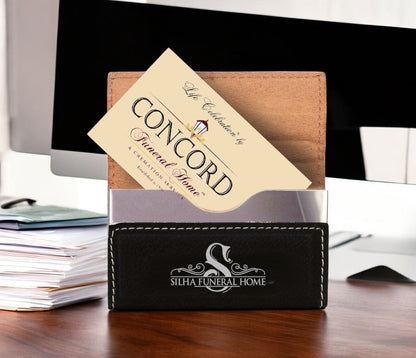 This elegant business card case holder features a luxurious black leatherette suede material, creating a refined and professional impression. Expertly engraved with your funeral home logo in silver, it perfectly complements the sleek silver metal edging that securely holds your cards in place. Ideal for subtle yet effective branding, it’s a thoughtful way to present your business with sophistication.