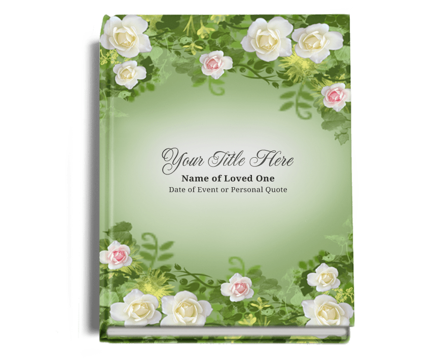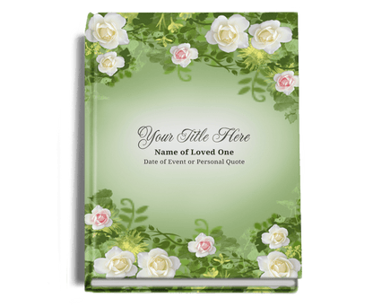 The delicate mini rose blossoms are carefully arrayed within the vines in this beautiful funeral guest book design. This guest book is designed to preserve and display the delicate mini rose blossoms in an elegant and organized fashion, making it a perfect tribute to your loved one.