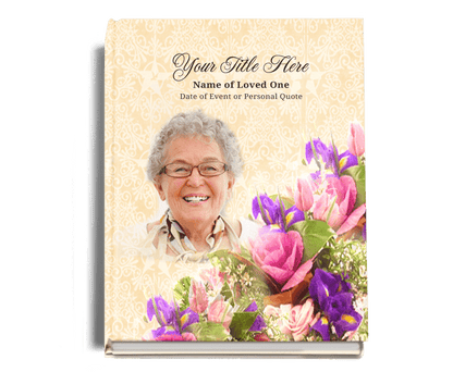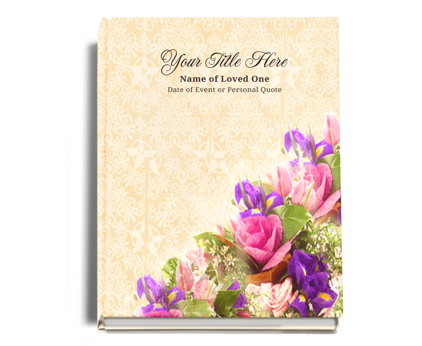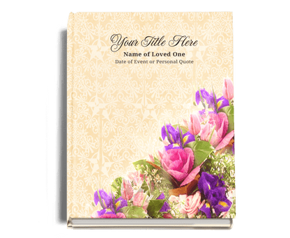 A lovely arrangement of a pastel floral bouquet sits perfectly amidst the textured lace background of this funeral guest book cover. The intricate design captures the beauty and serenity of a floral motif, perfect for those who appreciate timeless elegance.