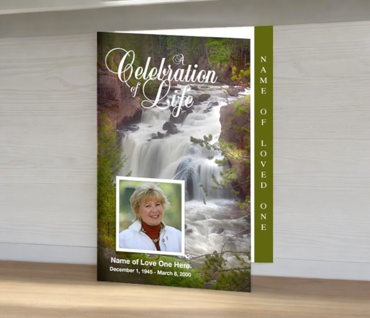 The Graceful 4-Sided Graduated Funeral Program Template features a serene waterfall flowing through a rugged and peaceful natural landscape, symbolizing tranquility, continuity, and the beauty of life’s journey. The soft imagery creates a calming tribute that gently honors the memory of a cherished loved one. The Graceful 4-Sided Graduated Funeral Program Template provides an elegant and soothing backdrop for personal reflection and remembrance.