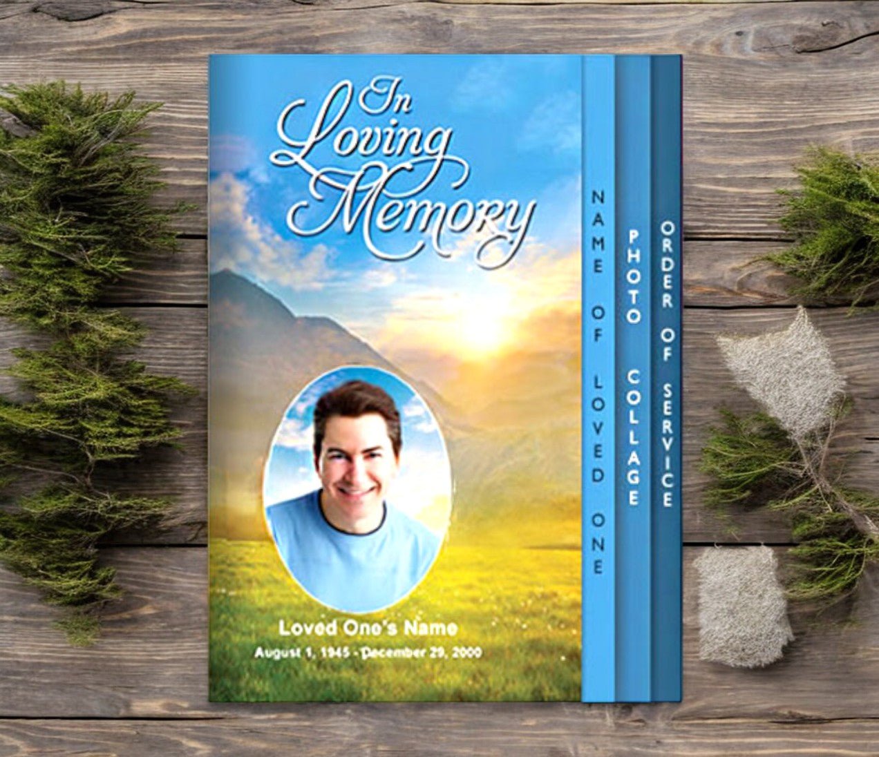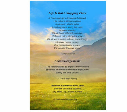 The Horizon 8-Sided Graduated Program Template features a breathtaking mountain landscape with a radiant sunrise stretching across a flourishing meadow. This inspiring design creates a peaceful and reflective atmosphere, perfect for honoring a loved one’s memory with natural beauty and warmth. The Horizon 8-Sided Graduated Program Template includes a dedicated space beneath the rising sun to showcase the photo of the departed, framed in a meaningful and serene setting.