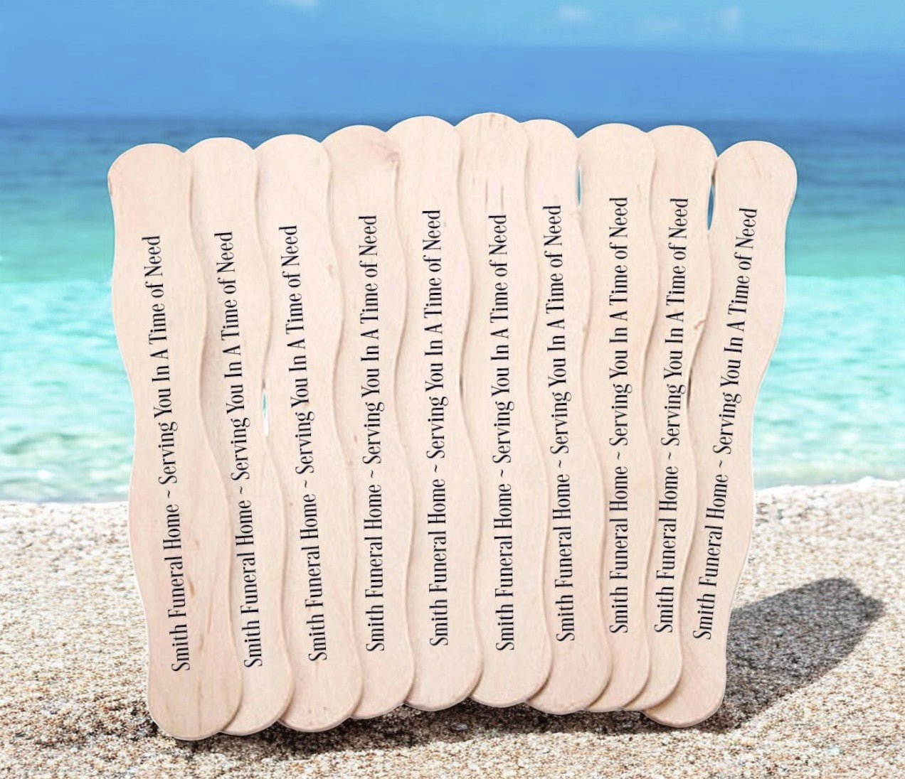 Does your funeral home offer memorial fans to families you serve? If so, The Funeral Program Site provides personalized wooden fan handles—an excellent way to add a professional touch and promote your brand during services. Each wooden handle can be imprinted with one line of custom text or your funeral home logo on one side, creating a memorable and subtle marketing tool seen by all attendees.