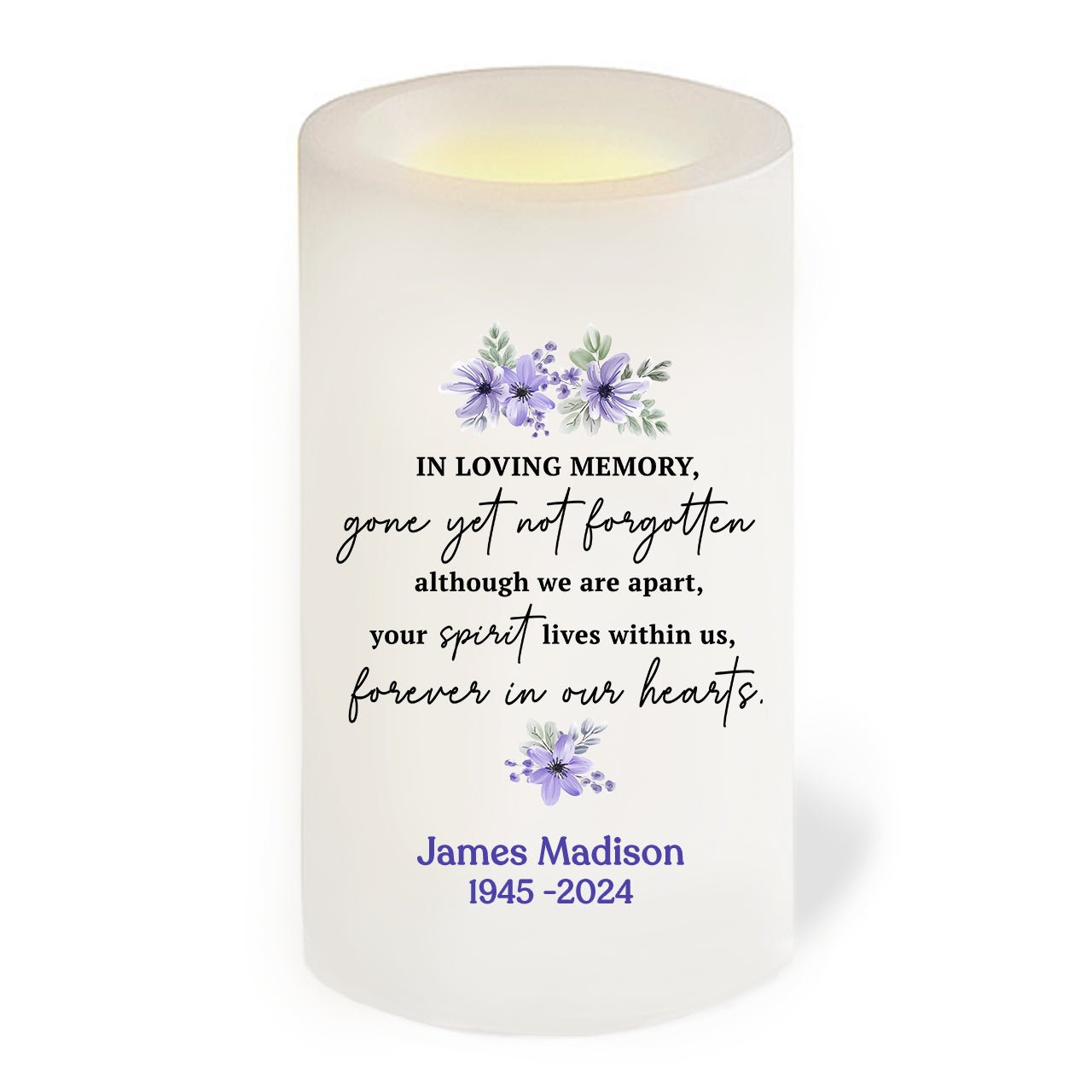 The In Loving Memory Personalized Flameless LED Memorial Candle offers a heartfelt tribute to honor a loved one. The touching words, 'In loving memory, gone yet not forgotten, although we are apart, your spirit lives within us, forever in our hearts,' adorn this candle, bringing comfort and warmth to those in remembrance. Delicate purple floral accents add a beautiful touch to this candle, making it a meaningful symbol of love.