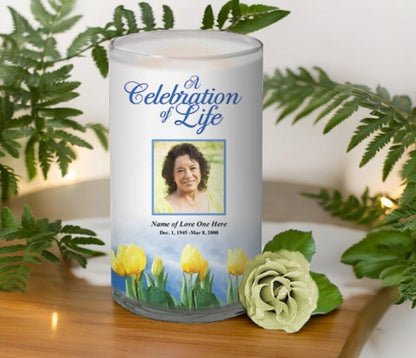 The Inspire Personalized Glass Memorial Candle from The Funeral Program Site features a graceful full-wrap design of soft springtime yellow tulips lining the base of the glass. Your personalized text can be added to create a meaningful tribute that honors your loved one with warmth, beauty, and quiet reflection. The floral artwork brings a touch of brightness and life, symbolizing hope and cherished memories that continue to bloom.