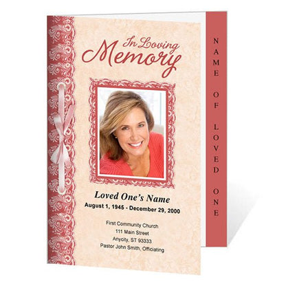 The Jasper 4-Sided Graduated Funeral Program Template features a refined and elegant design, highlighted by a delicate eyelet lace pattern and a soft satin ribbon detail set against a gentle marble background. This sophisticated layout offers a graceful way to showcase your loved one’s photo and memorial details. The Jasper 4-Sided Graduated Funeral Program Template combines classic textures with a warm, heartfelt presentation.