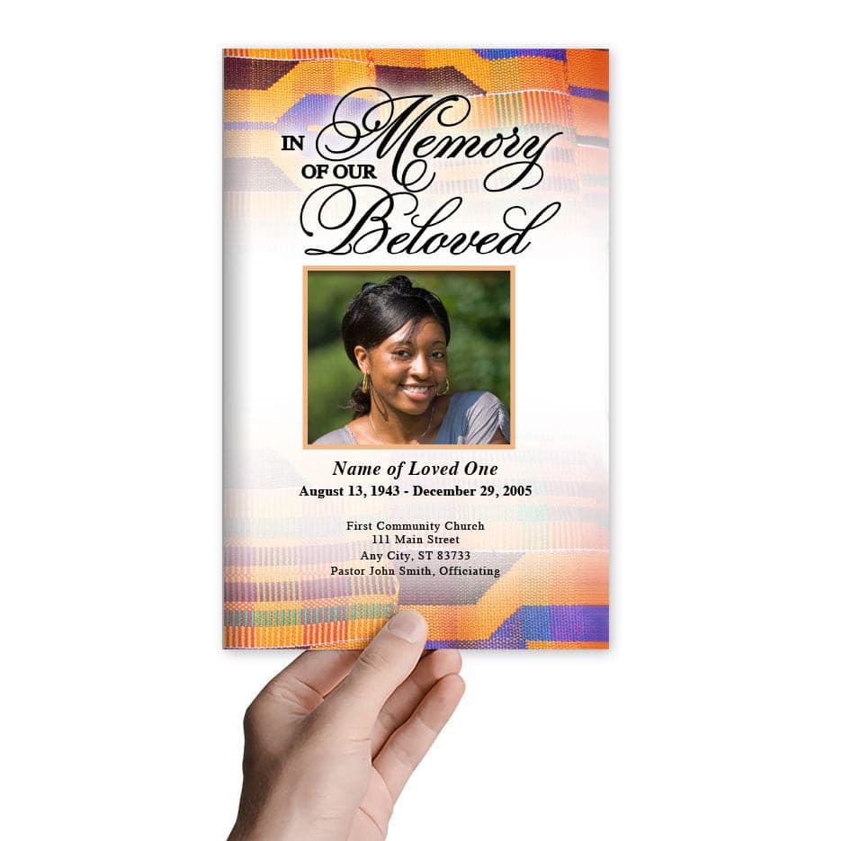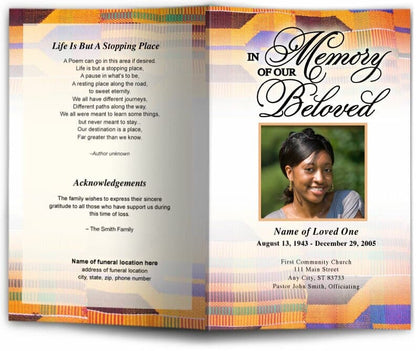 On the back, the Kente Funeral Program Template continues its cultural significance with a matching background design and a white translucent overlay, perfect for including a poem, scripture, or brief obituary. Inside, a complementary background gradient enhances the content area, offering a well-structured and visually appealing layout for the order of service, personal messages, and heartfelt tributes.