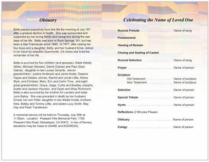 Don't have time to make your own funeral bulletin? No problem! Our service includes full professional design and printing delivered right to your door. Fast shipping in time for your service. Avoid the hassle of creating a funeral bulletin with our comprehensive service that includes expert design and printing, delivered straight to your door with quick shipping for your convenience.