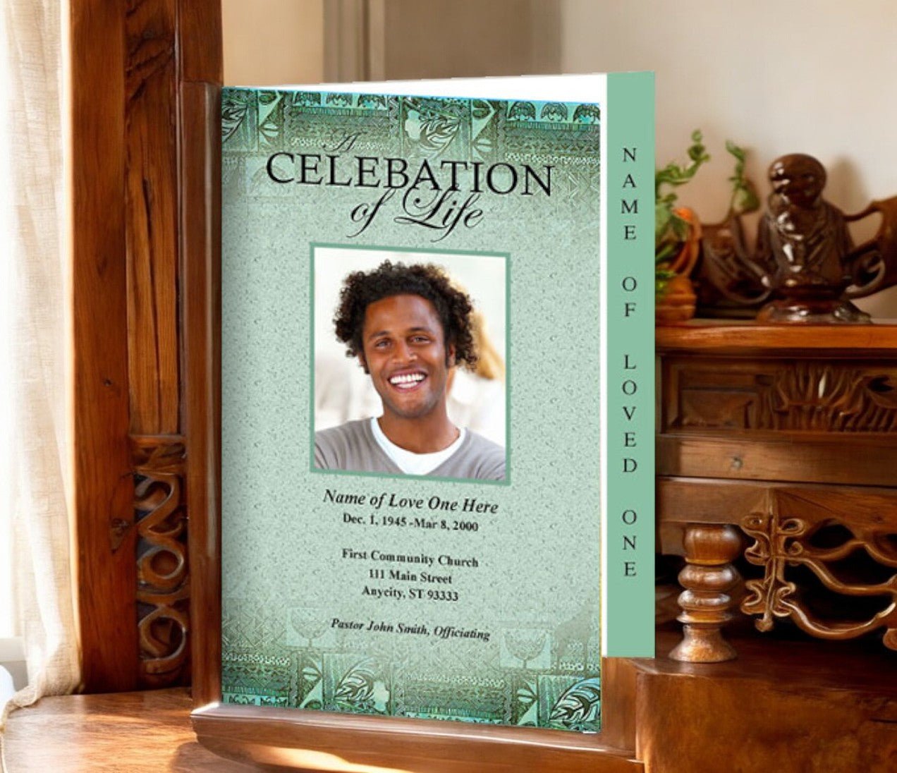 The Kwanzaa 4-Sided Graduated Funeral Program Template presents a culturally rich and visually striking design, featuring Kwanzaa-inspired borders and textured elements that reflect heritage and unity. The gradient backdrop blends warm brown and mint green hues, offering a dignified and vibrant tribute. The Kwanzaa 4-Sided Graduated Funeral Program Template is ideal for celebrating the life of someone who cherished tradition and community values.