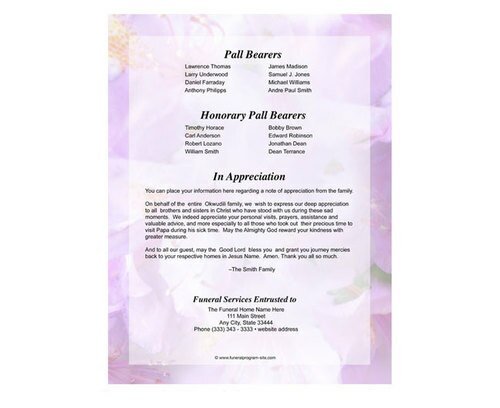 The back of the Lavender 8-Sided Funeral Graduated Program Template continues the floral theme with solid-color accents and a white transparent overlay, ideal for displaying acknowledgements, pallbearers, or personal messages. Interior right-side panels are clearly labeled for each section of the service, ensuring a polished and organized presentation. The Lavender 8-Sided Funeral Graduated Program Template serves as a gentle and heartfelt keepsake, celebrating a life remembered with warmth, elegance, and floral serenity.