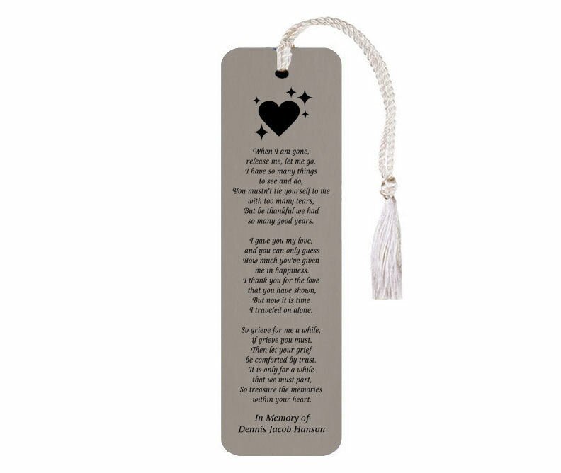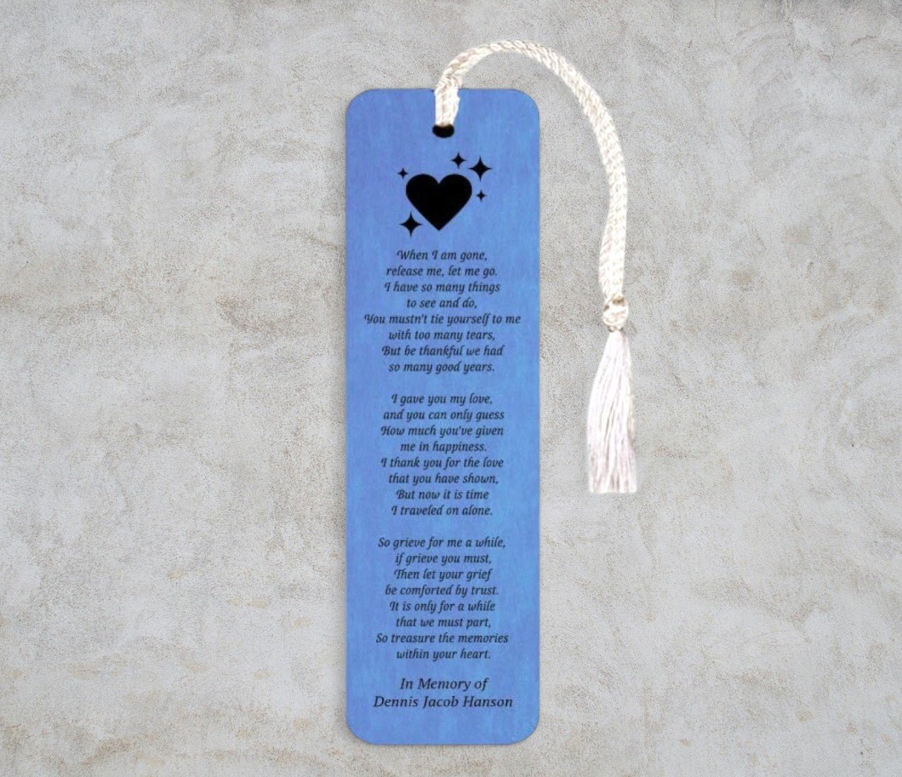 The Leatherette Memorial Bookmark To Those Who Loved Me Poem offers a simple yet elegant way to honor a loved one’s memory. Crafted with a soft leather-like feel and finished with rounded corners, this handsome bookmark comes in your choice of leatherette colors with a coordinating tassel for a refined touch. It makes a meaningful keepsake for memorial services, celebrations of life, or personal reflection, offering comfort each time it is held or placed inside a favorite book.