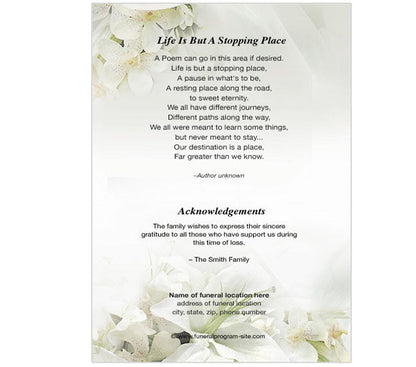 The back of the Lily 4-Sided Graduated Funeral Program Template continues with the coordinated lily background, offering a white transparent overlay ideal for a poem, short obituary, or acknowledgments. The Lily 4-Sided Graduated Funeral Program Template is a timeless and sophisticated keepsake to celebrate a meaningful life.