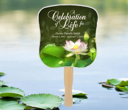 A lovely lotus flower sits delicately among lush green foliage in this peaceful memorial fan design, creating a calming visual that beautifully complements any remembrance gathering. The soft colors and floral elements help set a serene tone, offering a gentle moment of reflection for all who attend.