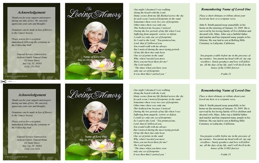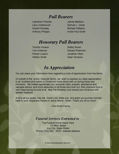 The back of the Lotus Small Memorial Card Template continues the gentle leaf motif, with a white transparent overlay that provides space to display a poem, verse, or special message. This elegant design captures the essence of peace and tranquility, offering a meaningful and serene way to honor your loved one. The Lotus Small Memorial Card Template is a fitting tribute to those cherished in life.