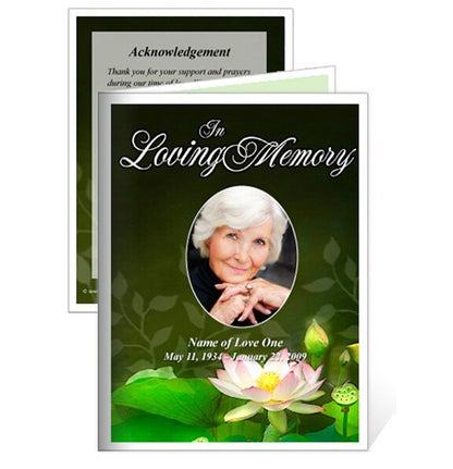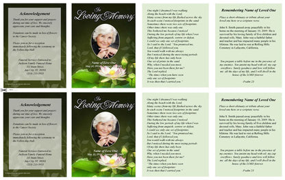 The Lotus Small Memorial Card Template features a beautiful floral design, with a large white lotus as the centerpiece. The central focus of the front cover is a framed photo of your beloved, allowing for a personalized and heartfelt tribute.