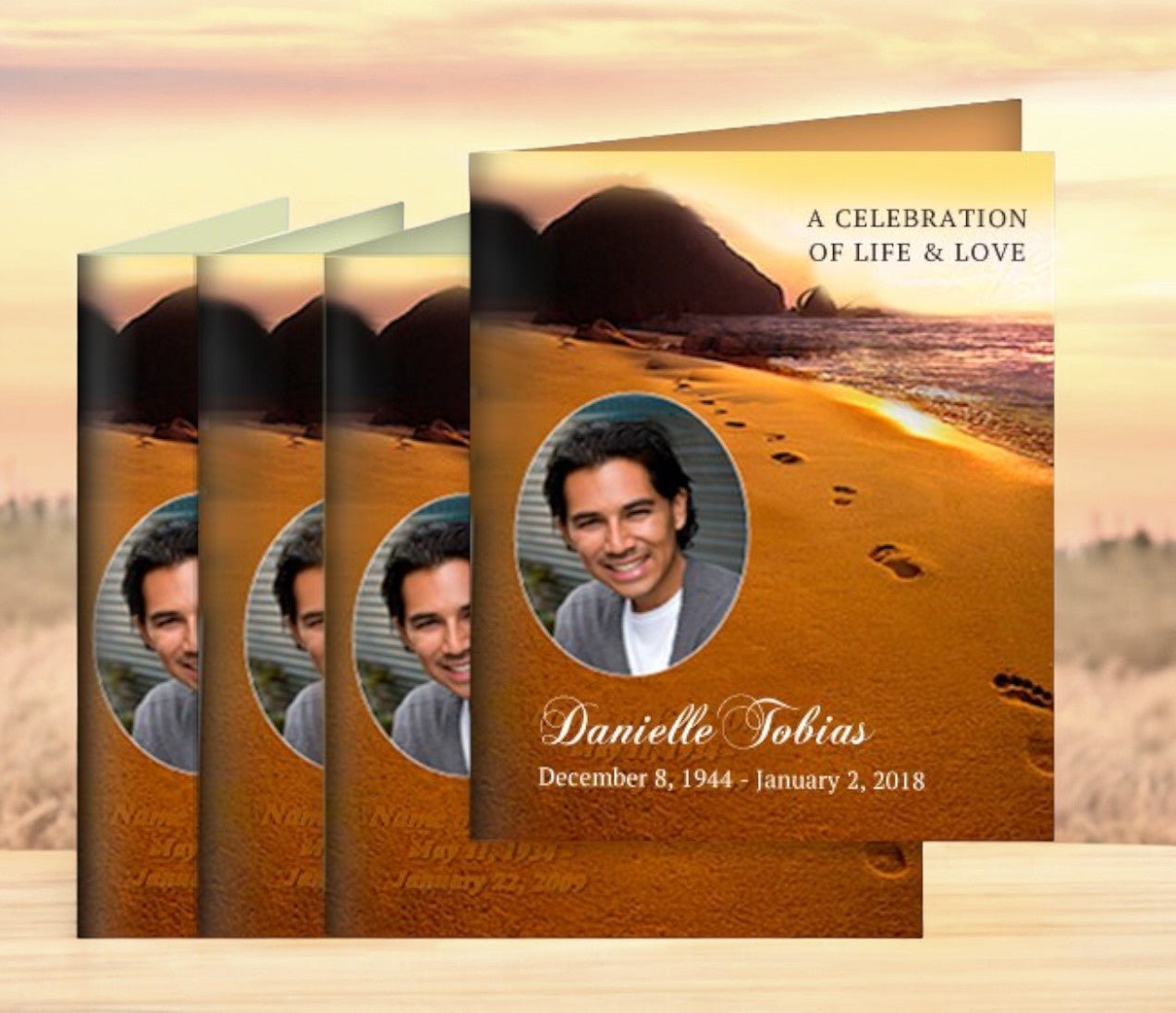 The Footprints Folded Memorial Card Design & Print captures the peaceful symbolism of life’s journey with a tranquil beachscape scene. Golden sands and a single set of footprints lead gently toward a radiant sunset, evoking reflection, faith, and eternal peace. This serene design offers a heartfelt way to celebrate your loved one’s memory, beautifully representing love, guidance, and the comforting presence of remembrance.
