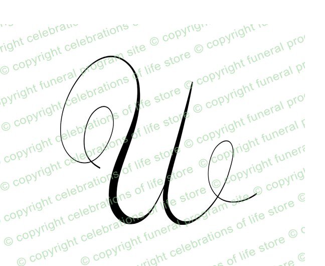 A beautiful and elegant monogram scripted letter “U” from The Funeral Program Site features a transparent background, allowing it to be placed seamlessly over any colored or pictured design. This refined letter is perfect for enhancing the front cover of a funeral program, instantly adding grace and sophistication to any plain template or document. You can also combine it with additional letters to create custom monograms and place them anywhere within your layout for a personalized touch.
