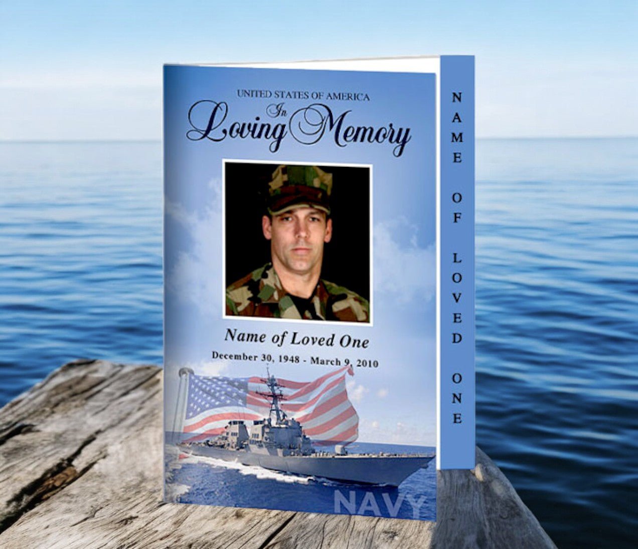 The Navy 4-Sided Graduated Funeral Program Template features a proud and patriotic design, honoring those who served in the United States Navy. A traditional naval ship sets sail against a backdrop of the American flag blowing in the wind, symbolizing strength, service, and dedication. The Navy 4-Sided Graduated Funeral Program Template offers a dignified and respectful tribute to a life committed to honor and duty.