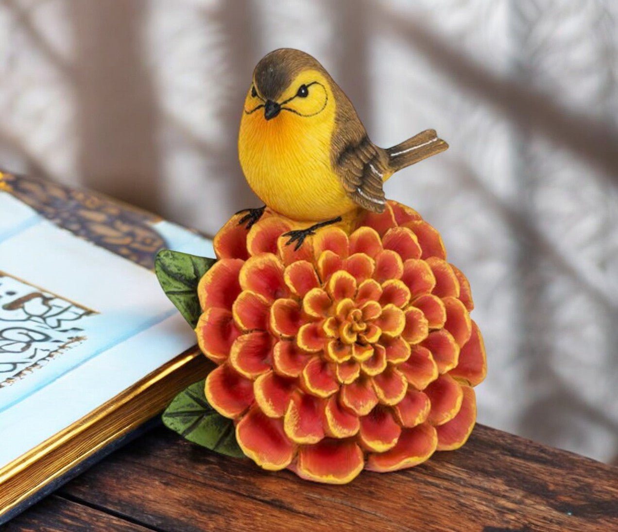 This thoughtful memorial and sympathy figurine features a vibrant coral marigold blossom, the signature flower of October, with a small bird gently perched on top. Birds are often seen as messengers between worlds, symbolizing a spiritual connection between this life and the next.