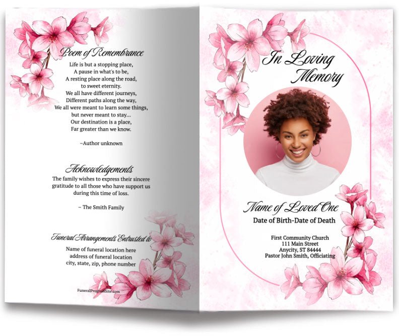 The Pansy Online Funeral Program Template features a watercolor pink floral border with a soft backdrop, creating a feminine and elegant design. This beautiful combination of florals and gentle tones offers a serene and graceful tribute to your loved one. The delicate watercolor florals add a unique and personal touch, perfect for celebrating their life.