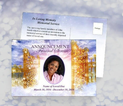 The Pathway Funeral Announcement Postcard Template presents a peaceful and spiritual design, featuring a tranquil cloudscape that frames the opening gates of heaven. At the heart of the design is space for a cherished photo of the departed, creating a personal and heartfelt tribute. The Pathway Funeral Announcement Postcard Template beautifully symbolizes the journey to eternal peace and is ideal for honoring a loved one with reverence and grace.
