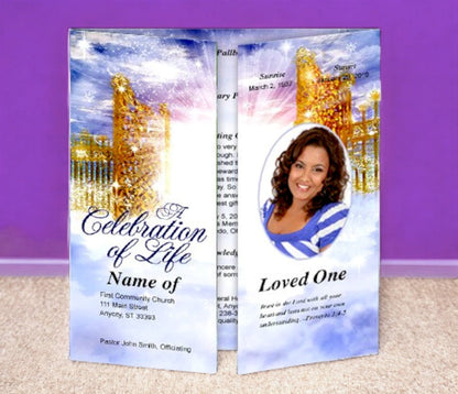 The Pathway Gatefold Program Template features gleaming golden gates surrounded by soft, billowing clouds, creating a heavenly tribute. This elegantly designed template unfolds to reveal six customizable panels, offering ample space for a heartfelt obituary, order of service, and cherished memories. The Pathway Gatefold Program Template provides a serene and uplifting design, perfect for honoring a loved one’s life. The back of the Pathway Gatefold Program Template presents a complementary background, ideal for displaying meaningful words or a personal message.