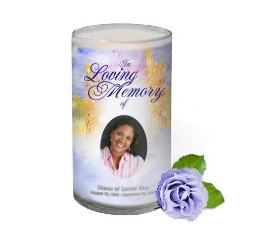 The Pathway Personalized Glass Memorial Candle from The Funeral Program Site features a serene full-wrap design depicting golden gates opening to a peaceful heavenly scene. Your personalized text can be added to create a meaningful tribute that reflects love, remembrance, and a sense of eternal comfort. This imagery offers a hopeful reminder of a beautiful resting place and continued spiritual presence.